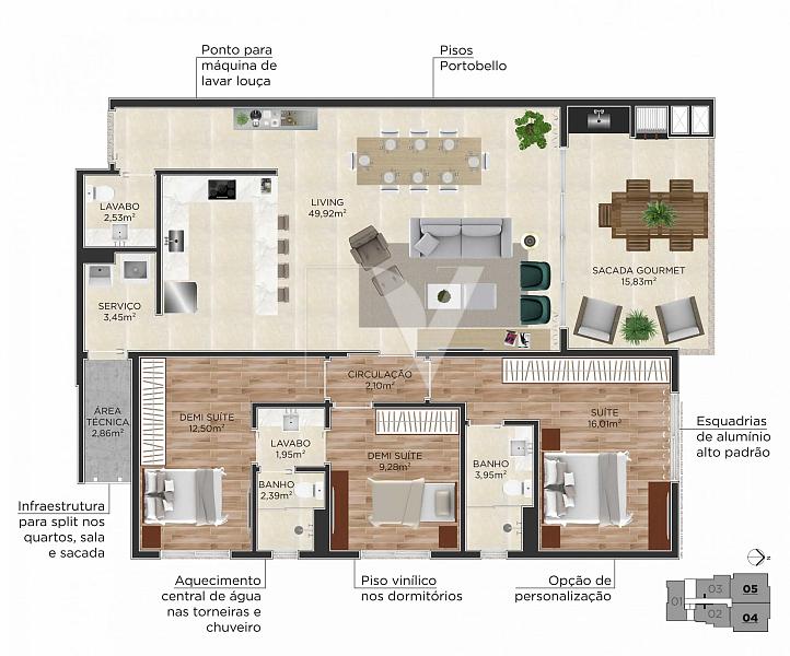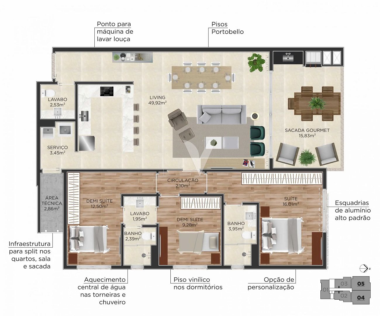 Este apartamento no 5º pavimento foi projetado para quem valoriza o convívio. Com uma planta inteligente, ele oferece ambientes amplos, iluminados e uma integração perfeita. Destaque total para o Hobby Box privativo (quase 7m²!), ideal para guardar equipamentos de lazer, e as duas vagas de garagem individuais.