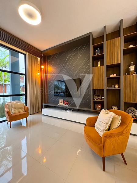 – Sala de Estar mobiliada com sofá, duas cadeiras estofadas, painel de TV e TV