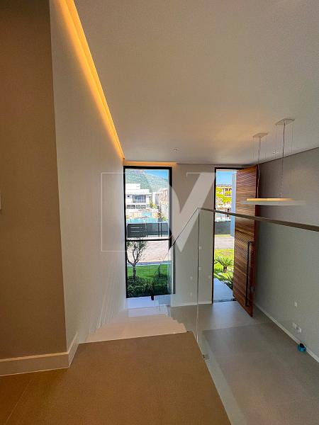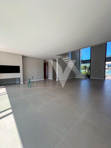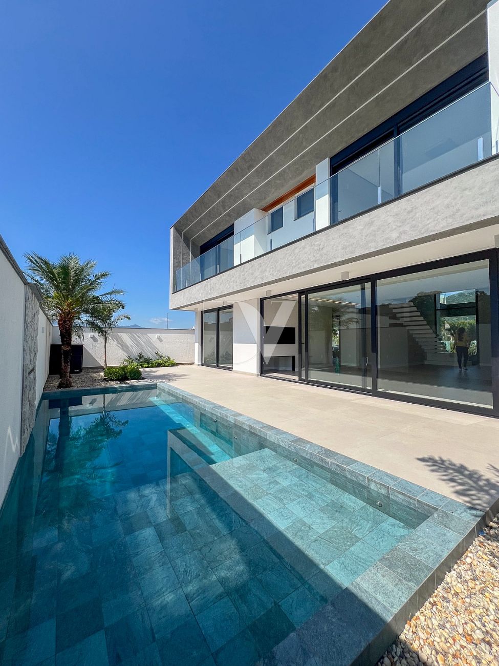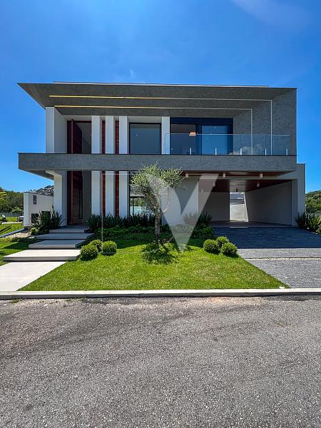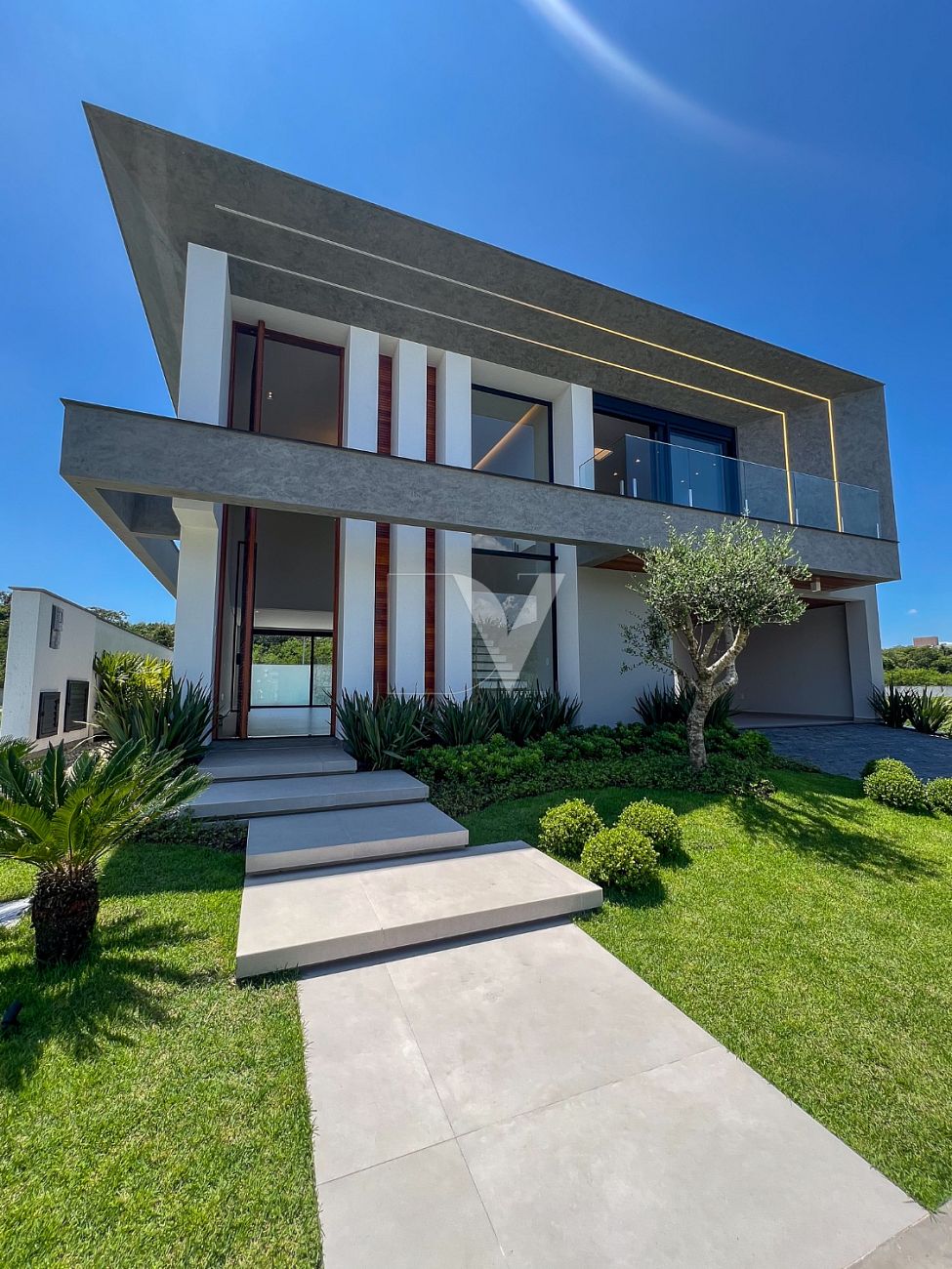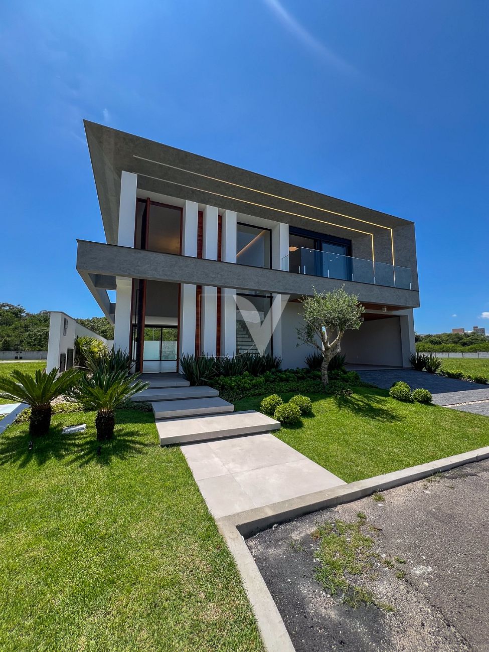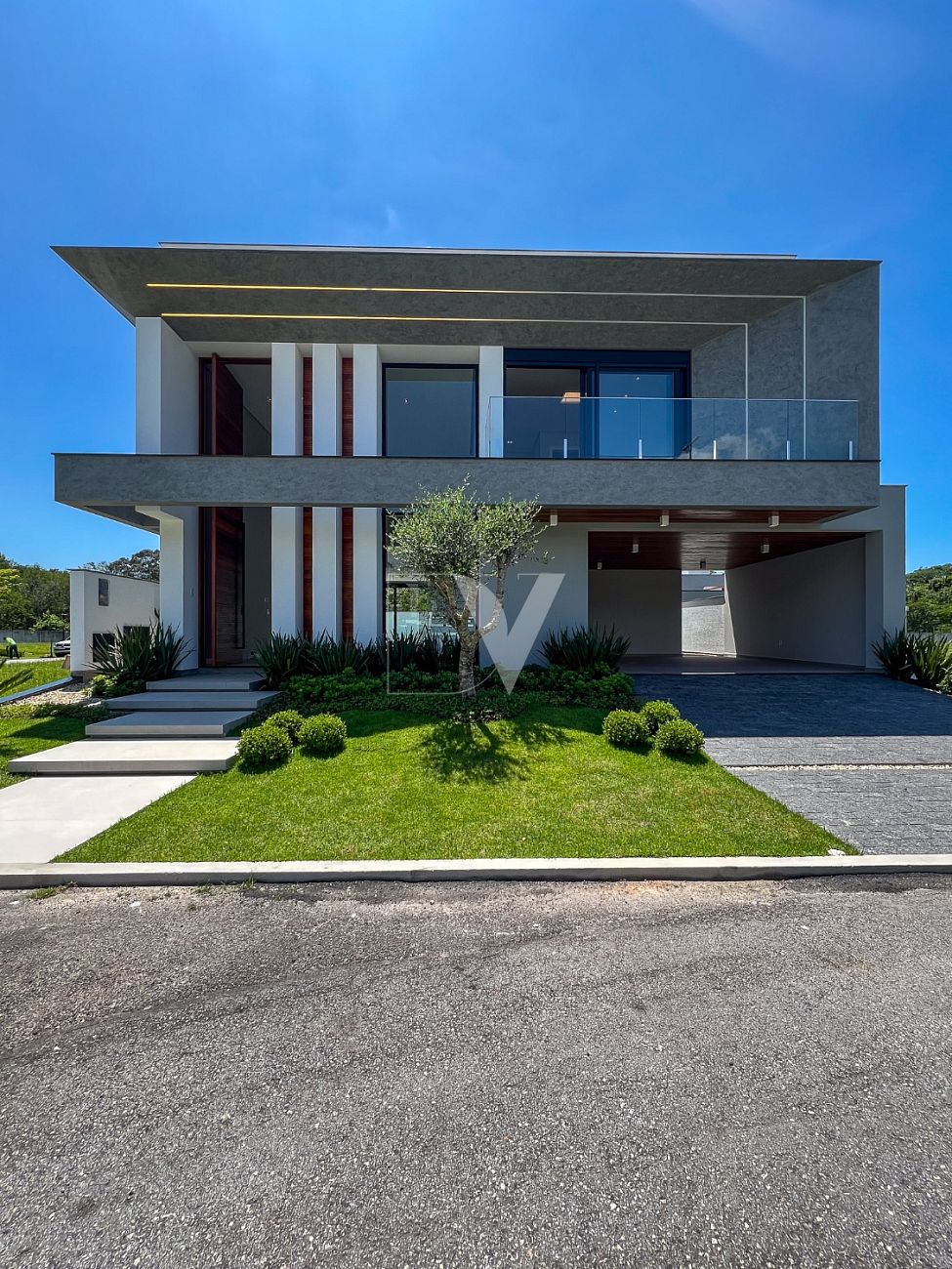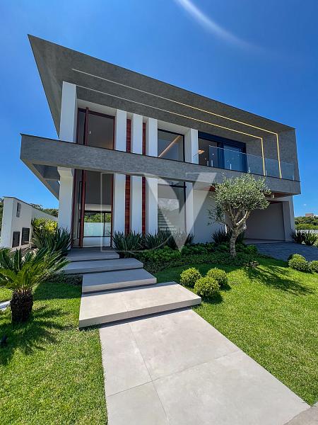Viva o auge da sofisticação e tecnologia no Condomínio Reserva da Pedra, em Pedra Branca – Palhoça/SC. Esta residência de alto padrão, com 334,76m² de área construída, impressiona pela fachada imponente com pé direito duplo, acabamentos em cimento queimado e paisagismo completo.