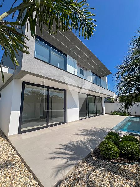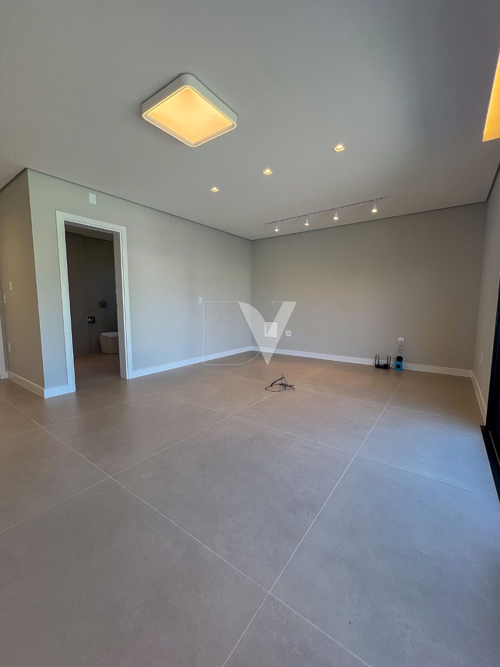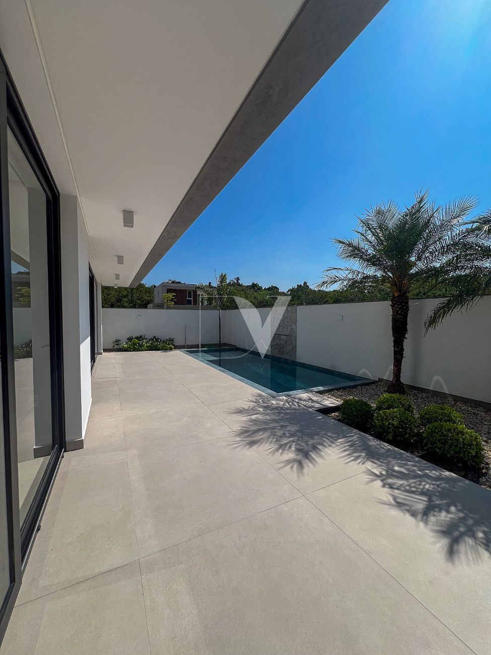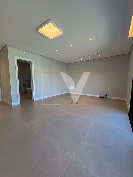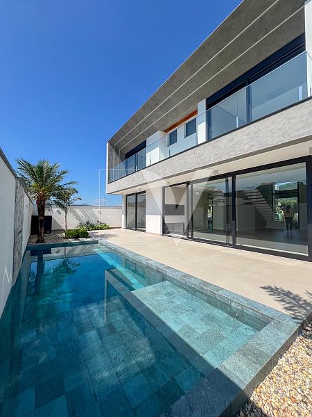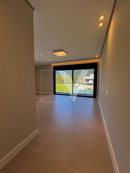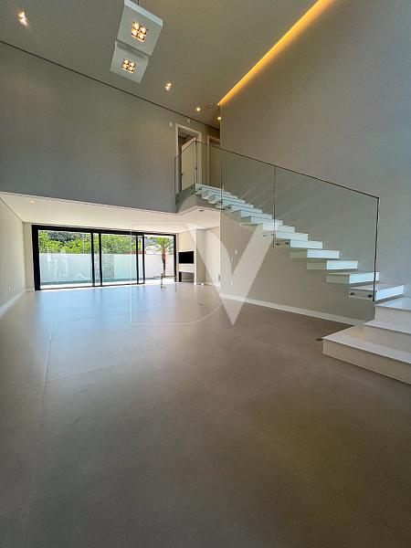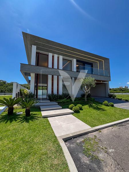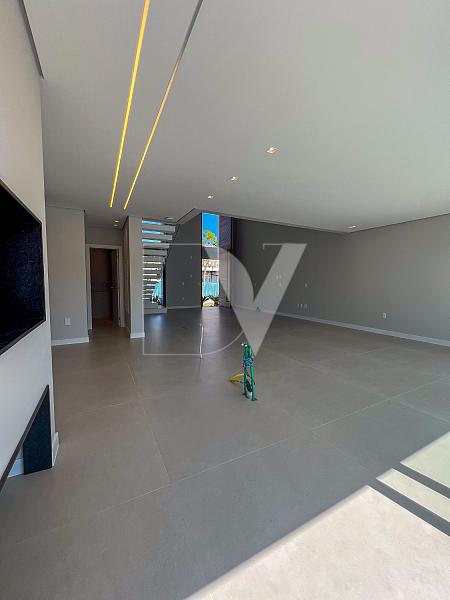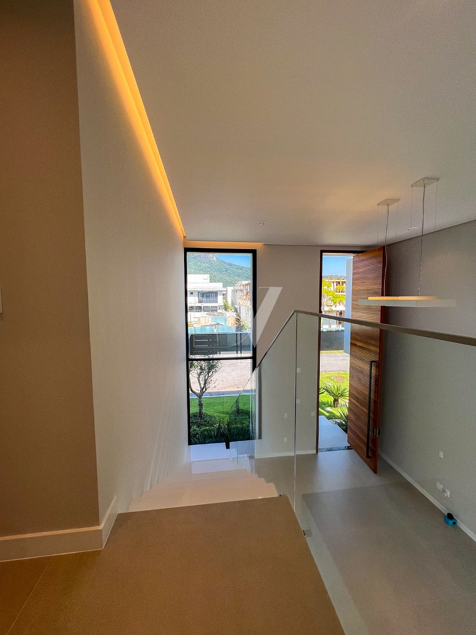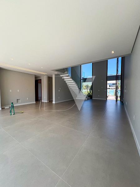Viva o auge da sofisticação e tecnologia no Condomínio Reserva da Pedra, em Pedra Branca – Palhoça/SC. Esta residência de alto padrão, com 334,76m² de área construída, impressiona pela fachada imponente com pé direito duplo, acabamentos em cimento queimado e paisagismo completo.
