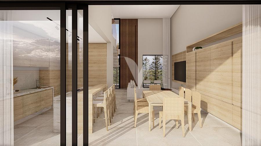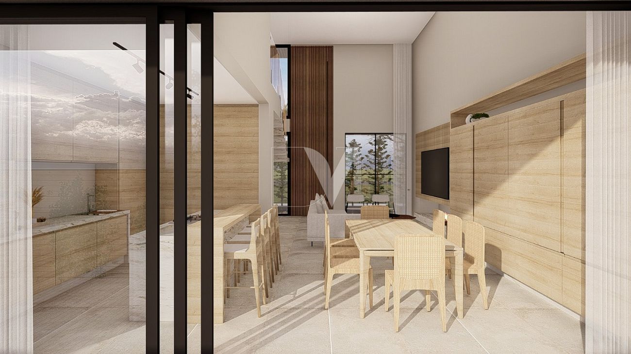 • Área Social Integrada: Living com pé-direito duplo e jantar conectados à cozinha gourmet, criando um ambiente perfeito para receber convidados.
