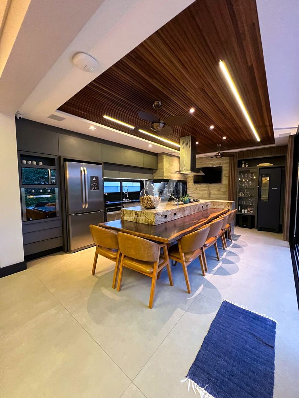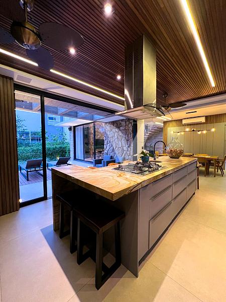 • Detalhes personalizados: móveis planejados, armário para ternos sob medida e acabamento orgânico que preserva a textura natural das pedras