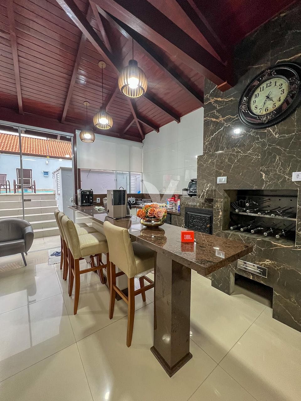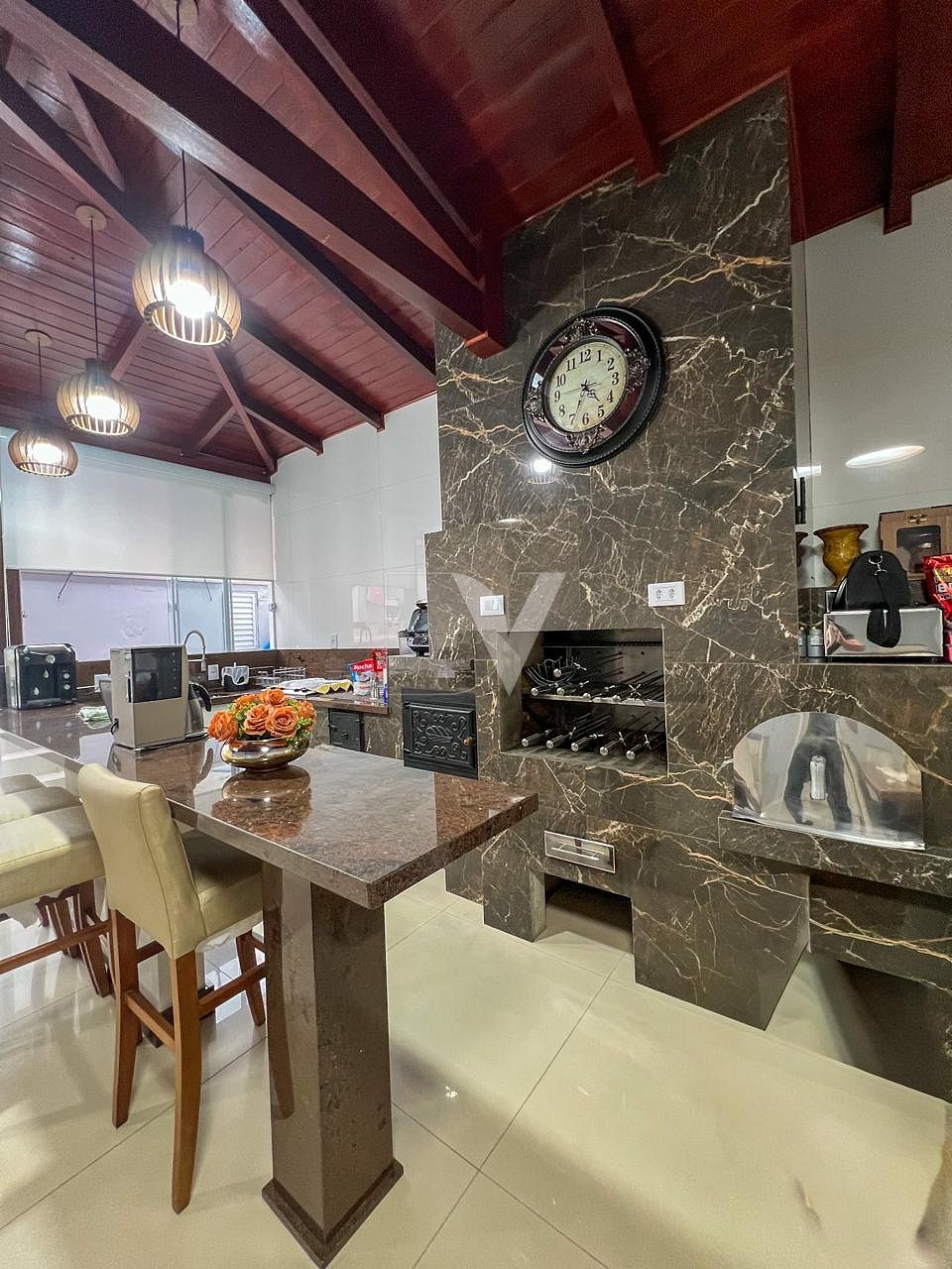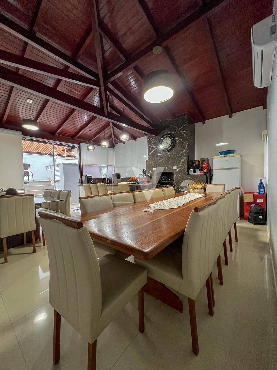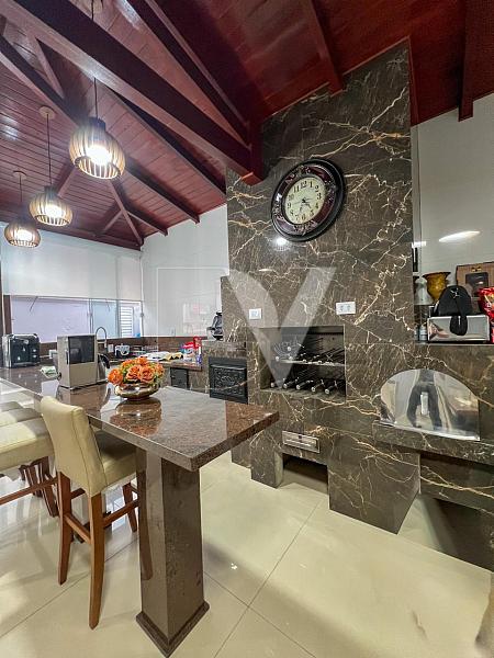 • Área de festas com pé-direito duplo, equipada com churrasqueira, forno de pizza, bancada espaçosa e mesa para grandes encontros. Um verdadeiro ambiente gourmet para receber amigos e familiares.
